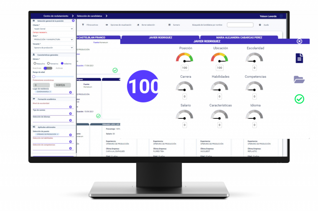 Nuestra plataforma hace mas eficiente el proceso de atracción realizando la calificación y clasificación de acuerdo a la vacante creando un aprendizaje a través de algoritmos e inteligencia artificial haciendo sugerencias de calibración de las expectativas del mercado laboral versus las condiciones entregadas generando la fuerza de atracción necesaria para cubrir las vacantes solicitadas en tiempos óptimos.
